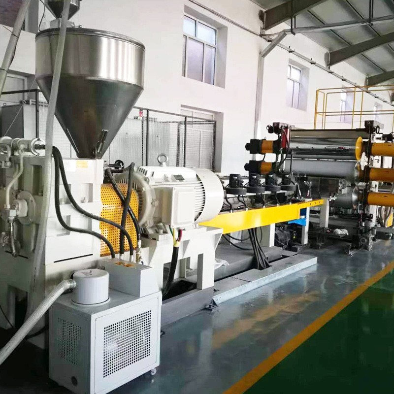 La línea de producción de geoceldas de láminas de plástico HDPP/PE se utiliza para producir geoceldas. El primer paso de este producto es producir láminas, luego las láminas se cortan en línea y luego las láminas de plástico se conectan a través de soldadura ultrasónica y otros métodos