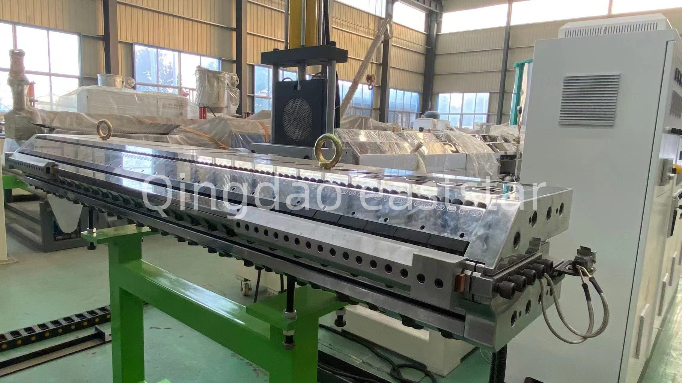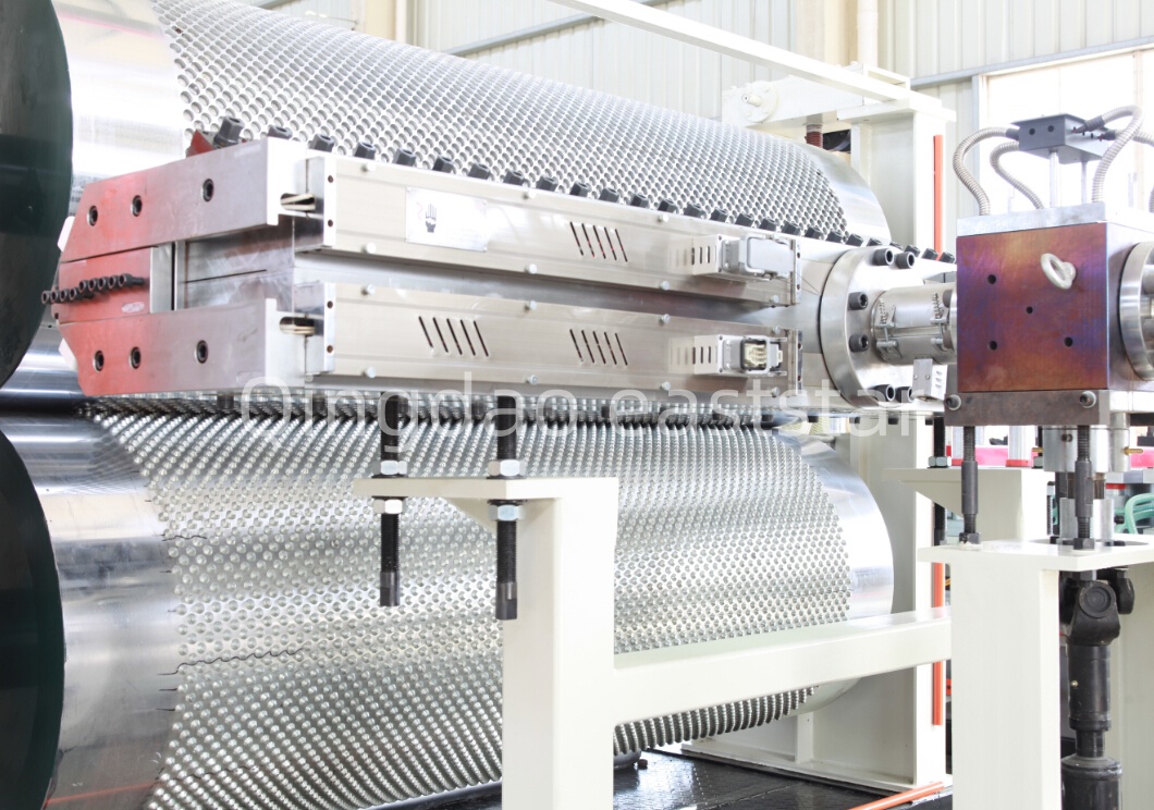 El sistema de matriz delLínea de producción de tableros de drenaje de PEadopta un diseño de guía tipo percha, con un ancho de matriz de 1650 mm, capaz de producir tableros de drenaje de una sola capa con un espesor de 0,8-1,2 mm. La superficie del troquel está cromada y pulida hasta obtener un acabado de espejo, con una rugosidad de la cavidad de Ra0,1um y una rugosidad del labio del troquel de Ra0,05um. El dispositivo formador de dos rodillos está equipado con rodillos de Φ450×1700 mm, con una dureza de superficie de rodillos de HRC58-62 y un espesor de cromado de 0,08 mm. Un diseño especial de múltiples canales garantiza una temperatura uniforme. Estas configuraciones profesionales garantizan que los productos de tableros de drenaje producidos por ellínea de montajetener una estructura punteada uniforme y un rendimiento de drenaje estable.