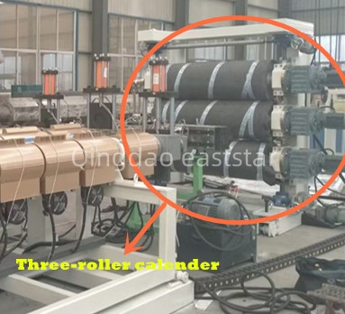 El sistema de matriz delLínea de producción de láminas de coextrusión multicapa de ABSadopta un diseño de canal de flujo tipo percha, con un ancho de matriz de 2200 mm y equipado con un distribuidor de precisión para garantizar una distribución uniforme del material en cada capa. La calandria de tres rodillos está equipada con rodillos con acabado de espejo de Φ450×2500 mm, con una dureza de la superficie del rodillo de HRC58-62 y un espesor de cromado de 0,08 mm. Un diseño especial multicanal garantiza una temperatura uniforme. El sistema de control de temperatura del rodillo utiliza agua purificada y ablandada como medio, con una precisión de control de temperatura de ±1 ℃, y está equipado con tres bombas de agua caliente de 2,2 KW y tres juegos de calentadores de 12 KW para proporcionar un ambiente de temperatura preciso para el conformado de láminas.
