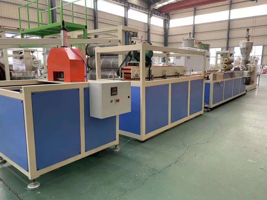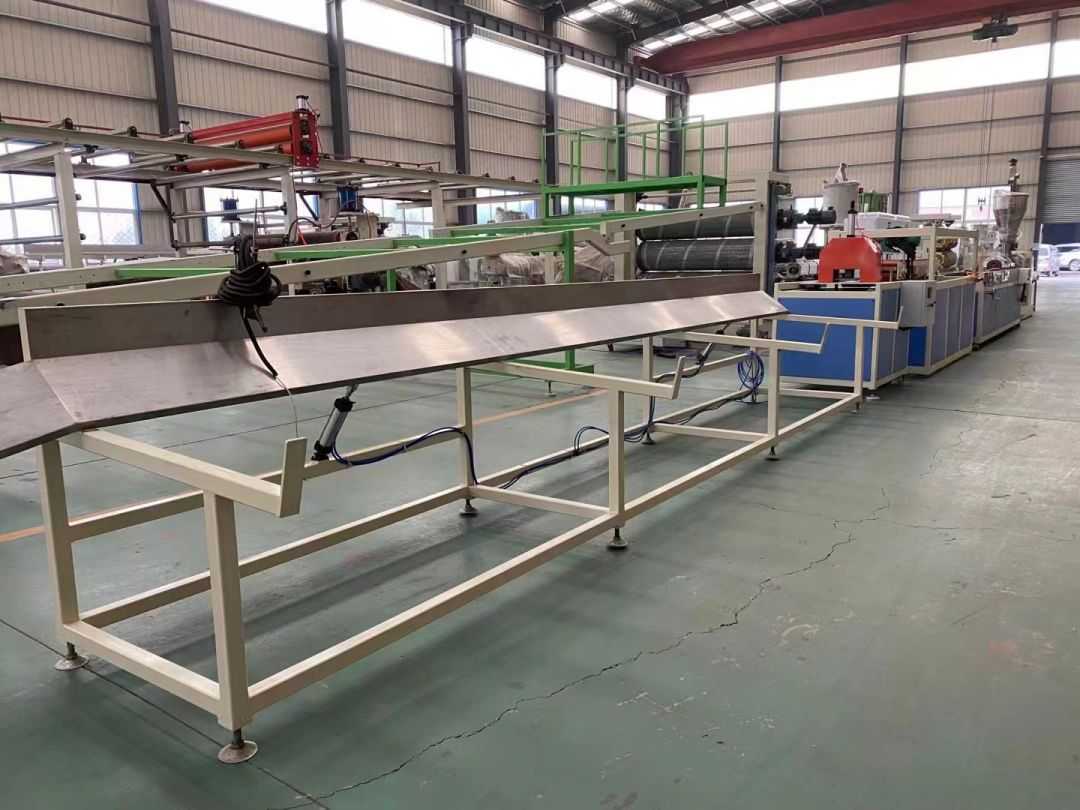 La línea de producción de perfiles utiliza extrusoras cónicas de doble tornillo serie SJSZ-65/132, plataformas de conformado al vacío de acero inoxidable, tractores de orugas, máquinas integradas de corte automático y estantes de descarga abatibles. La plataforma moldeadora está equipada con una bomba de vacío de alta presión y una bomba de agua ajustables en cuatro dimensiones. El tractor se sujeta neumáticamente. La máquina cortadora automática de longitud fija utiliza un interruptor de recorrido para cortar a una longitud fija. La estantería de apilamiento tiene 6 metros de largo, está fabricada en acero inoxidable y se voltea neumáticamente.