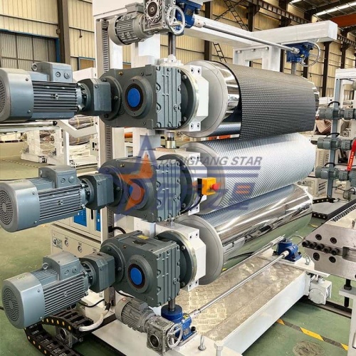 La línea de producción dedicada a tapetes antideslizantes de TPE SJ120/33 es un equipo de producción profesional diseñado específicamente para materiales de tapetes de elastómero termoplástico (TPE). Adopta una extrusora de alta potencia con relación de aspecto de 33:1, moldes de precisión tipo percha, un sistema de calandrado de tres rodillos con espejo y un dispositivo de corte completamente automático. Puede producir de manera eficiente tapetes antideslizantes de TPE de alta calidad con anchos de 600 a 1000 mm y espesores de 1 a 6 mm. El equipo está optimizado para las características del material TPE, con control de temperatura preciso, operación simple y soporte para cambios rápidos de producción. Es particularmente adecuado para la producción a gran escala de tapetes para automóviles, tapetes antideslizantes para el hogar y materiales para tapetes comerciales. Con un corto retorno de la inversión y una calidad de producto estable, es una opción ideal para ingresar al mercado de las alfombras de TPE.